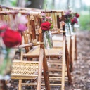 The Bamboo chair is made out of natural bamboo and has a clear coated glossy finish. It features a curved back and wide seat with reinforced braces for additional strength.